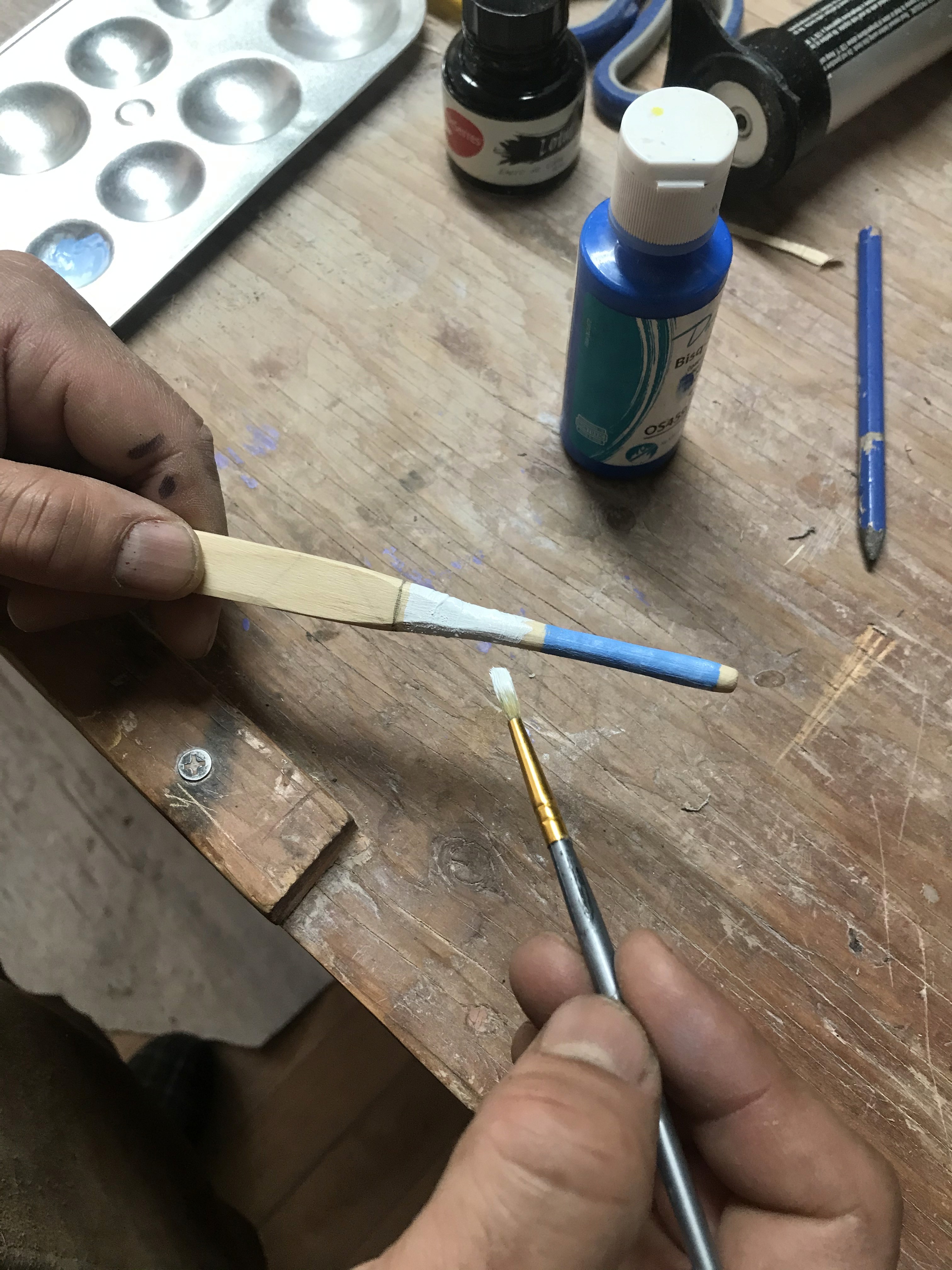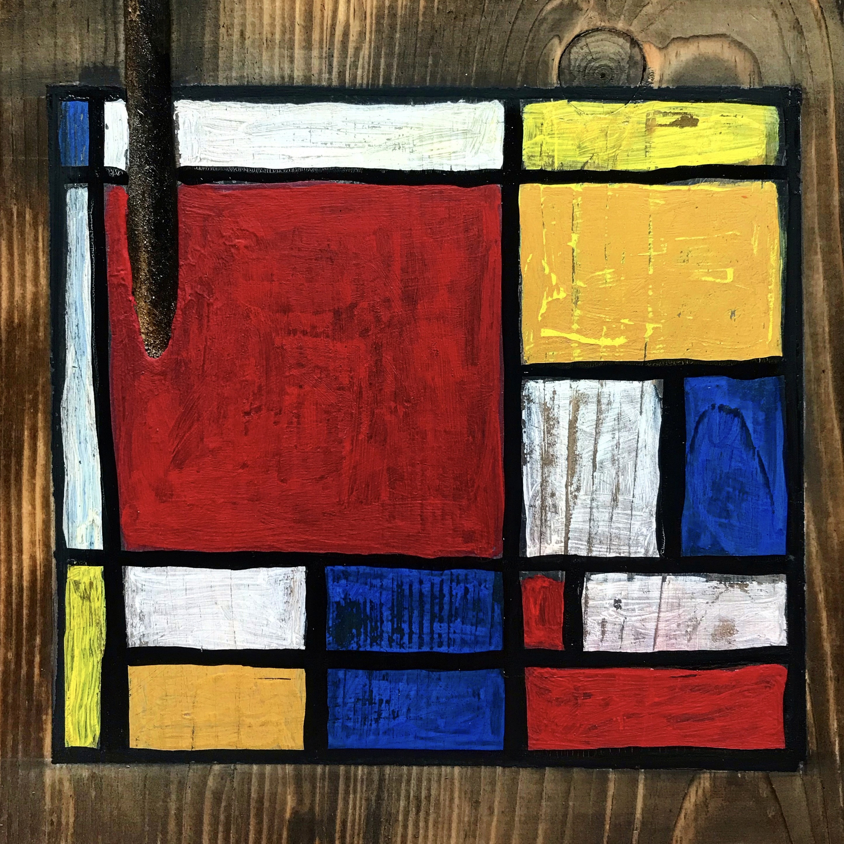 Acrylic, oil sticks, crayons, and markers on wood.