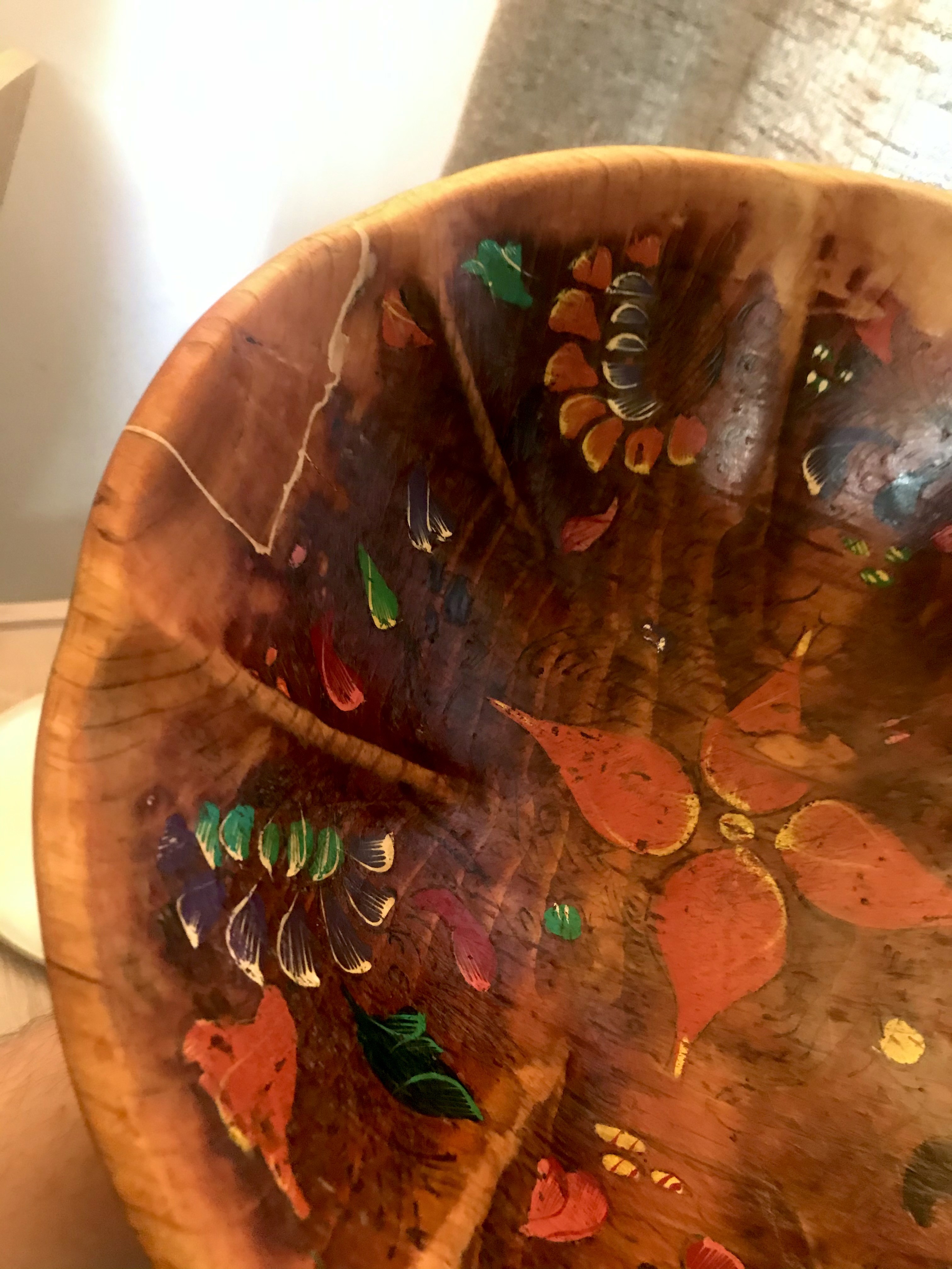 An old wooden bowl from India. Bought over 50 years ago. It broke. I fixed it. Back at the table, hopeful for another decade.
